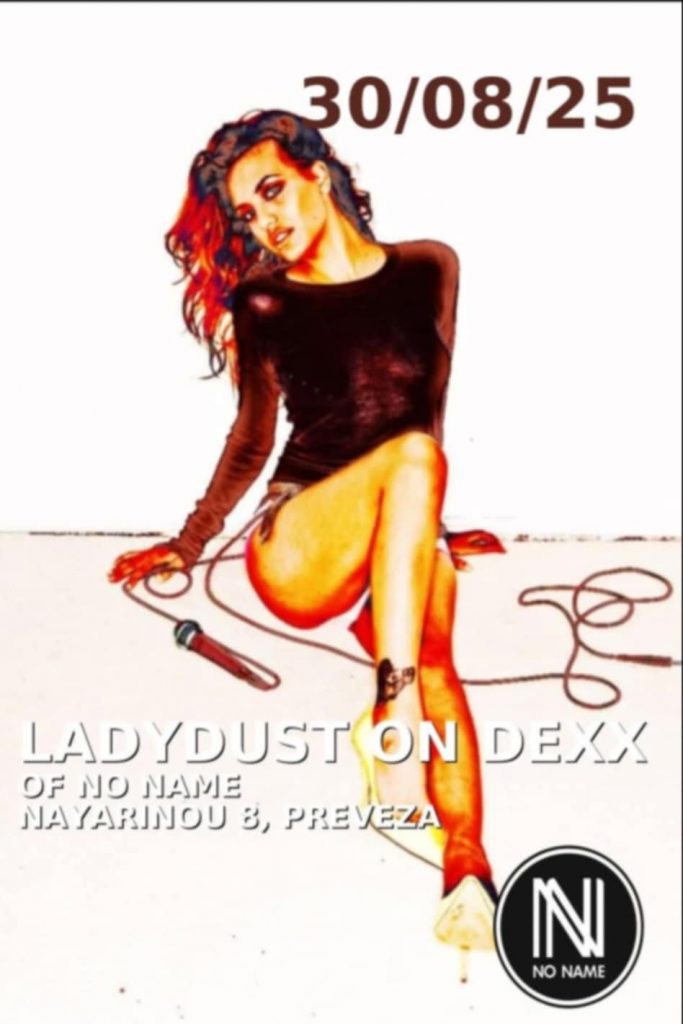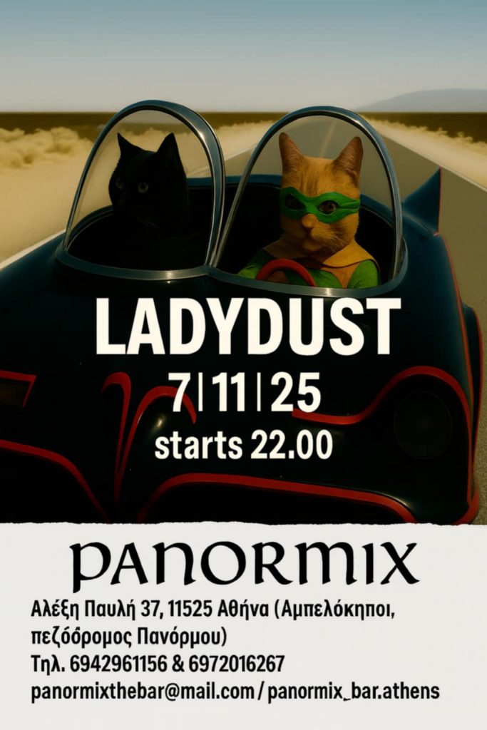 Some Venues Where Ladydust's DJ Sets Have Been Hosted: Gagarin, Fuzz Club, Technopolis, Petras Theater, Half Note Jazz Club, Zappeion Mansion, 360 Bazaar/Syntagma Square, TerraVibe Adventure Park, Kinono, Nixon, Tsin Tsin, It's a Village, Passport Live Space, Miga, Six D.O.G.S, Braff, Tiki, Fouar, Rabbithole, O Mpampas, Hard Rock Cafe, O Kipos tis Kalasnikof, Alley Cat, Skyfall, Corto Maltese, Bad Tooth, Metz, Death Disco, Sfiga, Dude, Booze Cooperativa, Closer, 10ΒΗΤΑ, Cantina Social, Sixnotites, Selofan, Intrepid Fox, Drunk Sinatra, Spinster, Jackson Hall Spirit, Stavros tou Notou, Ippo, Tokyo, Mousa, Belafonte, Mosaiko, Anima, Blue Bar, V4, Kafeneio, Key Bar, The Party, Ritzy, Drugstore, Pinocchio, Locomotiva, Floral, Kafeoino, Rinokeros, Suzie Q, Tribe, Hoxton, Dunkel, Escoba, Frogs, Lost & Found, Underworld, Garage, Celline, Old Habits, Azor, Darling, Egalite, Mikro, Portrait, Gazaki, Mosaic Cafe, Modluv, Folie, Σουρεαλ Cantina Cultura, Romantso, Charlie's, Psipsina, Big Easy, Teddy Boy, Error, Vinylio, Burger Disco, Samiamidi, Palatine, Σωρηδον, Old Boy, Kino, Sante Rock Bar, Vox (Athens), Diatiriteo, Art House, Residents, La Doze, Rover, (Thessaloniki), More Steps, Lennon, Akti, Dexameni Project (Patra), Artichoke, Miraggio (Corinth), Stoa, Boxx, To Mparaki) (Ioannina), Stage (Larisa), Fidel, Kalashnikov, Otro (Serres), Sinagogi, To Vazaki, Fournos (Chania), Fortuna (Sougia), Jive (Rethymno), Cafe Santan (Volos),Thalassografia, Motel, H Aliki exei to lathos agori (Kavala), Blow Up (Herakleio), En Arti (Arta), Peppermint Motel (Ierapetra), Bar 2, (Nafpaktos), Matala (Crete), Moroa Beach Bar (Neoi Poroi), Passport, Okio, Red, Piree (Piraeus), Mylos (Kws), Klepsydra (Trikala), Cultural Festival (Milos), Nono, Dam, Costa Costa (Chalkidiki), Casablanca Soul (Santorini), eLife Congress (Plastera Lake), Astra, Agios Sostis Beach (Mykonos), Mode, Escoba (Kozani), Cadillac Records (Karditsa), Bocca, Cargo (Alexandroupoli), Roots (Lamia), Elia (Syros), Fox Anglais (Kythera), Red (Katerini), Legends (Rhodes), No Name (Preveza), La Haulle Freussinet (Paris), The Others, Hackney Cut (London), Control, Kristal Stage (Bucharest).