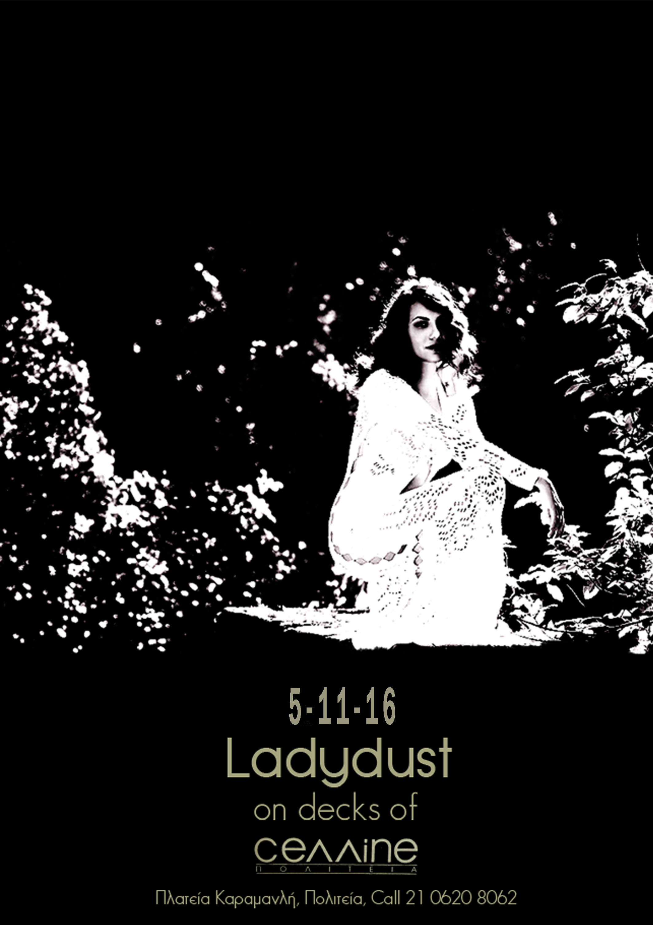 Some Venues Where Ladydust's DJ Sets Have Been Hosted: Gagarin, Fuzz Club, Technopolis, Petras Theater, Half Note Jazz Club, Zappeion Mansion, 360 Bazaar/Syntagma Square, TerraVibe Adventure Park, Kinono, Nixon, Tsin Tsin, It's a Village, Passport Live Space, Miga, Six D.O.G.S, Braff, Tiki, Fouar, Rabbithole, O Mpampas, Hard Rock Cafe, O Kipos tis Kalasnikof, Alley Cat, Skyfall, Corto Maltese, Bad Tooth, Metz, Death Disco, Sfiga, Dude, Booze Cooperativa, Closer, 10ΒΗΤΑ, Cantina Social, Sixnotites, Selofan, Intrepid Fox, Drunk Sinatra, Spinster, Jackson Hall Spirit, Stavros tou Notou, Ippo, Tokyo, Mousa, Belafonte, Mosaiko, Anima, Blue Bar, V4, Kafeneio, Key Bar, The Party, Ritzy, Drugstore, Pinocchio, Locomotiva, Floral, Kafeoino, Rinokeros, Suzie Q, Tribe, Hoxton, Dunkel, Escoba, Frogs, Lost & Found, Underworld, Garage, Celline, Old Habits, Azor, Darling, Egalite, Mikro, Portrait, Gazaki, Mosaic Cafe, Modluv, Folie, Σουρεαλ Cantina Cultura, Romantso, Charlie's, Psipsina, Big Easy, Teddy Boy, Error, Vinylio, Burger Disco, Samiamidi, Palatine, Σωρηδον, Old Boy, Kino, Sante Rock Bar, Vox (Athens), Diatiriteo, Art House, Residents, La Doze, Rover, (Thessaloniki), More Steps, Lennon, Akti, Dexameni Project (Patra), Artichoke, Miraggio (Corinth), Stoa, Boxx, To Mparaki) (Ioannina), Stage (Larisa), Fidel, Kalashnikov, Otro (Serres), Sinagogi, To Vazaki, Fournos (Chania), Fortuna (Sougia), Jive (Rethymno), Cafe Santan (Volos),Thalassografia, Motel, H Aliki exei to lathos agori (Kavala), Blow Up (Herakleio), En Arti (Arta), Peppermint Motel (Ierapetra), Bar 2, (Nafpaktos), Matala (Crete), Moroa Beach Bar (Neoi Poroi), Passport, Okio, Red, Piree (Piraeus), Mylos (Kws), Klepsydra (Trikala), Cultural Festival (Milos), Nono, Dam, Costa Costa (Chalkidiki), Casablanca Soul (Santorini), eLife Congress (Plastera Lake), Astra, Agios Sostis Beach (Mykonos), Mode, Escoba (Kozani), Cadillac Records (Karditsa), Bocca, Cargo (Alexandroupoli), Roots (Lamia), Elia (Syros), Fox Anglais (Kythera), Red (Katerini), Legends (Rhodes), No Name (Preveza), La Haulle Freussinet (Paris), The Others, Hackney Cut (London), Control, Kristal Stage (Bucharest).