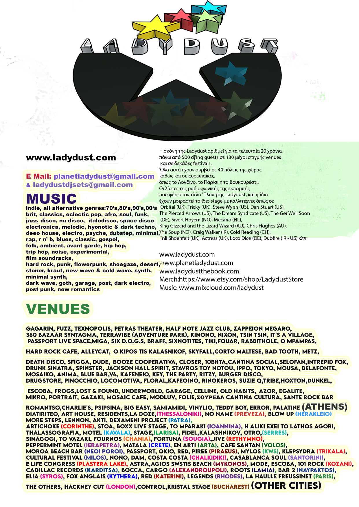 Some Venues Where Ladydust's DJ Sets Have Been Hosted: Gagarin, Fuzz Club, Technopolis, Petras Theater, Half Note Jazz Club, Zappeion Mansion, 360 Bazaar/Syntagma Square, TerraVibe Adventure Park, Kinono, Nixon, Tsin Tsin, It's a Village, Passport Live Space, Miga, Six D.O.G.S, Braff, Tiki, Fouar, Rabbithole, O Mpampas, Hard Rock Cafe, O Kipos tis Kalasnikof, Alley Cat, Skyfall, Corto Maltese, Bad Tooth, Metz, Death Disco, Sfiga, Dude, Booze Cooperativa, Closer, 10ΒΗΤΑ, Cantina Social, Sixnotites, Selofan, Intrepid Fox, Drunk Sinatra, Spinster, Jackson Hall Spirit, Stavros tou Notou, Ippo, Tokyo, Mousa, Belafonte, Mosaiko, Anima, Blue Bar, V4, Kafeneio, Key Bar, The Party, Ritzy, Drugstore, Pinocchio, Locomotiva, Floral, Kafeoino, Rinokeros, Suzie Q, Tribe, Hoxton, Dunkel, Escoba, Frogs, Lost & Found, Underworld, Garage, Celline, Old Habits, Azor, Darling, Egalite, Mikro, Portrait, Gazaki, Mosaic Cafe, Modluv, Folie, Σουρεαλ Cantina Cultura, Romantso, Charlie's, Psipsina, Big Easy, Teddy Boy, Error, Vinylio, Burger Disco, Samiamidi, Palatine, Σωρηδον, Old Boy, Kino, Sante Rock Bar, Vox (Athens), Diatiriteo, Art House, Residents, La Doze, Rover, (Thessaloniki), More Steps, Lennon, Akti, Dexameni Project (Patra), Artichoke, Miraggio (Corinth), Stoa, Boxx, To Mparaki) (Ioannina), Stage (Larisa), Fidel, Kalashnikov, Otro (Serres), Sinagogi, To Vazaki, Fournos (Chania), Fortuna (Sougia), Jive (Rethymno), Cafe Santan (Volos),Thalassografia, Motel, H Aliki exei to lathos agori (Kavala), Blow Up (Herakleio), En Arti (Arta), Peppermint Motel (Ierapetra), Bar 2, (Nafpaktos), Matala (Crete), Moroa Beach Bar (Neoi Poroi), Passport, Okio, Red, Piree (Piraeus), Mylos (Kws), Klepsydra (Trikala), Cultural Festival (Milos), Nono, Dam, Costa Costa (Chalkidiki), Casablanca Soul (Santorini), eLife Congress (Plastera Lake), Astra, Agios Sostis Beach (Mykonos), Mode, Escoba (Kozani), Cadillac Records (Karditsa), Bocca, Cargo (Alexandroupoli), Roots (Lamia), Elia (Syros), Fox Anglais (Kythera), Red (Katerini), Legends (Rhodes), No Name (Preveza), La Haulle Freussinet (Paris), The Others, Hackney Cut (London), Control, Kristal Stage (Bucharest).