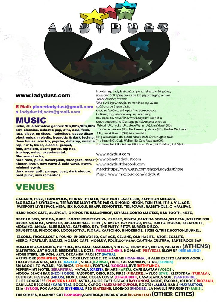Some Venues Where Ladydust's DJ Sets Have Been Hosted: Gagarin, Fuzz Club, Technopolis, Petras Theater, Half Note Jazz Club, Zappeion Mansion, 360 Bazaar/Syntagma Square, TerraVibe Adventure Park, Kinono, Nixon, Tsin Tsin, It's a Village, Passport Live Space, Miga, Six D.O.G.S, Braff, Tiki, Fouar, Rabbithole, O Mpampas, Hard Rock Cafe, O Kipos tis Kalasnikof, Alley Cat, Skyfall, Corto Maltese, Bad Tooth, Metz, Death Disco, Sfiga, Dude, Booze Cooperativa, Closer, 10ΒΗΤΑ, Cantina Social, Sixnotites, Selofan, Intrepid Fox, Drunk Sinatra, Spinster, Jackson Hall Spirit, Stavros tou Notou, Ippo, Tokyo, Mousa, Belafonte, Mosaiko, Anima, Blue Bar, V4, Kafeneio, Key Bar, The Party, Ritzy, Drugstore, Pinocchio, Locomotiva, Floral, Kafeoino, Rinokeros, Suzie Q, Tribe, Hoxton, Dunkel, Escoba, Frogs, Lost & Found, Underworld, Garage, Celline, Old Habits, Azor, Darling, Egalite, Mikro, Portrait, Gazaki, Mosaic Cafe, Modluv, Folie, Σουρεαλ Cantina Cultura, Romantso, Charlie's, Psipsina, Big Easy, Teddy Boy, Error, Vinylio, Burger Disco, Samiamidi, Palatine, Σωρηδον, Old Boy, Kino, Sante Rock Bar, Vox (Athens), Diatiriteo, Art House, Residents, La Doze, Rover, (Thessaloniki), More Steps, Lennon, Akti, Dexameni Project (Patra), Artichoke, Miraggio (Corinth), Stoa, Boxx, To Mparaki) (Ioannina), Stage (Larisa), Fidel, Kalashnikov, Otro (Serres), Sinagogi, To Vazaki, Fournos (Chania), Fortuna (Sougia), Jive (Rethymno), Cafe Santan (Volos),Thalassografia, Motel, H Aliki exei to lathos agori (Kavala), Blow Up (Herakleio), En Arti (Arta), Peppermint Motel (Ierapetra), Bar 2, (Nafpaktos), Matala (Crete), Moroa Beach Bar (Neoi Poroi), Passport, Okio, Red, Piree (Piraeus), Mylos (Kws), Klepsydra (Trikala), Cultural Festival (Milos), Nono, Dam, Costa Costa (Chalkidiki), Casablanca Soul (Santorini), eLife Congress (Plastera Lake), Astra, Agios Sostis Beach (Mykonos), Mode, Escoba (Kozani), Cadillac Records (Karditsa), Bocca, Cargo (Alexandroupoli), Roots (Lamia), Elia (Syros), Fox Anglais (Kythera), Red (Katerini), Legends (Rhodes), No Name (Preveza), La Haulle Freussinet (Paris), The Others, Hackney Cut (London), Control, Kristal Stage (Bucharest).