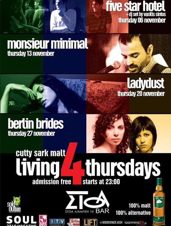 (Athens), Diatiriteo, Art House, Residents, La Doze, Rover, (Thessaloniki), More Steps, Lennon, Akti, Dexameni Project (Patra), Artichoke, Miraggio (Corinth), Stoa, Boxx, To Mparaki) (Ioannina), Stage (Larisa), Fidel, Kalashnikov, Otro (Serres), Sinagogi, To Vazaki, Fournos (Chania), Fortuna (Sougia), Jive (Rethymno), Cafe Santan (Volos),Thalassografia, Motel, H Aliki exei to lathos agori (Kavala), Blow Up (Herakleio), En Arti (Arta), Peppermint Motel (Ierapetra), Bar 2, (Nafpaktos), Matala (Crete), Moroa Beach Bar (Neoi Poroi), Passport, Okio, Red, Piree (Piraeus), Mylos (Kws), Klepsydra (Trikala), Cultural Festival (Milos), Nono, Dam, Costa Costa (Chalkidiki), Casablanca Soul (Santorini), eLife Congress (Plastera Lake), Astra, Agios Sostis Beach(Mykonos), Mode, Escoba(Kozani), Cadillac Records (Karditsa), Bocca, Cargo (Alexandroupoli), Roots (Lamia), Elia (Syros), Fox Anglais (Kythera), Red (Katerini), Legends(Rhodes), No Name (Preveza), La Haulle Freussinet (Paris), The Others, Hackney Cut (London), Control, Kristal Stage(Bucharest).