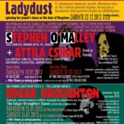 Ladydust has shared the stage with artists such as: Orbital (UK), Tricky (UK), Nadine Shah (UK), Get Well Soon (DE), Sivert Hoyem (NO), Craig Walker (IR), Mecano (NL), Irish Goodbyes (WI), The Soup (NO), Steve Wynn (US), Dan Stuart (US), Pierced Arrows (US), Phil Shoenfelt (UK), Dream Syndicate (US), Chris Hughes (AU), Cold Reading (CH), King Gizzard & the Lizard Wizard (AU), Actress (UK), Loco Dice (DE), and Dubfire (IR/US).